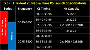 These two DDR5 memory kits designed specifically for the AMD Ryzen 7000 series. RGB and non-RGB options available for both kits. The Neo and Flare X5’s are programmed with AMD EXPO technology while also being created with hand-screened memory ICs. With this feature everyone gets the chance to experience the new AMD AM5 platform.